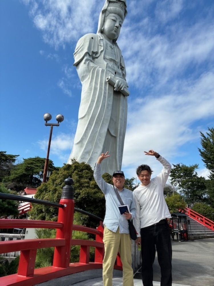 平日の昼間でしたがご年配の方たちが、マイボールを持ちながら練習に来ていました(@_@) さすが都会ですね!! ボウリングを堪能した後に 名物の高崎白衣大観音様を参拝しました(^^)v 一緒に写真を撮ったF君とてっぺんまで登って来ました! あとの8人は下で待ってる~!なんて言って登りませんでした⤵^^; その後 昼食をとり吉川区に向かい また反省大懇親会を行いました!